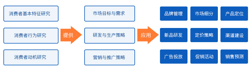 消費者研究是市場調(diào)研領(lǐng)域應(yīng)用最多的消費品市場研究的一個最基礎(chǔ)、主要的組成部分,包括消費者基本特征研究、消費者行為研究、消費者動機研究三大部分。通過這三個層面的研究,為相關(guān)行業(yè)和企業(yè)提供:市場細(xì)分、產(chǎn)品定位、品牌管理、定價策略、新品開發(fā)、渠道建設(shè)、廣告投放、促銷活動、銷售預(yù)測等行為的理論、數(shù)據(jù)基礎(chǔ)。