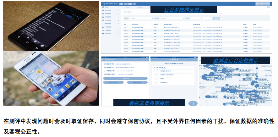 公司有著自主研發(fā)的數(shù)據(jù)采集系統(tǒng),以智能手機或平板電腦為載體,事先將制定指標(biāo)體系從系統(tǒng)后臺導(dǎo)入,執(zhí)行過程中的問題記錄是通過觸摸屏直接記錄,并傳送到系統(tǒng)終端,實現(xiàn)數(shù)據(jù)時時記錄時時上傳,系統(tǒng)后臺可觀測到監(jiān)測者的實時定位,從多種方面保證了數(shù)據(jù)的真實有效性。此系統(tǒng)的八大特點: